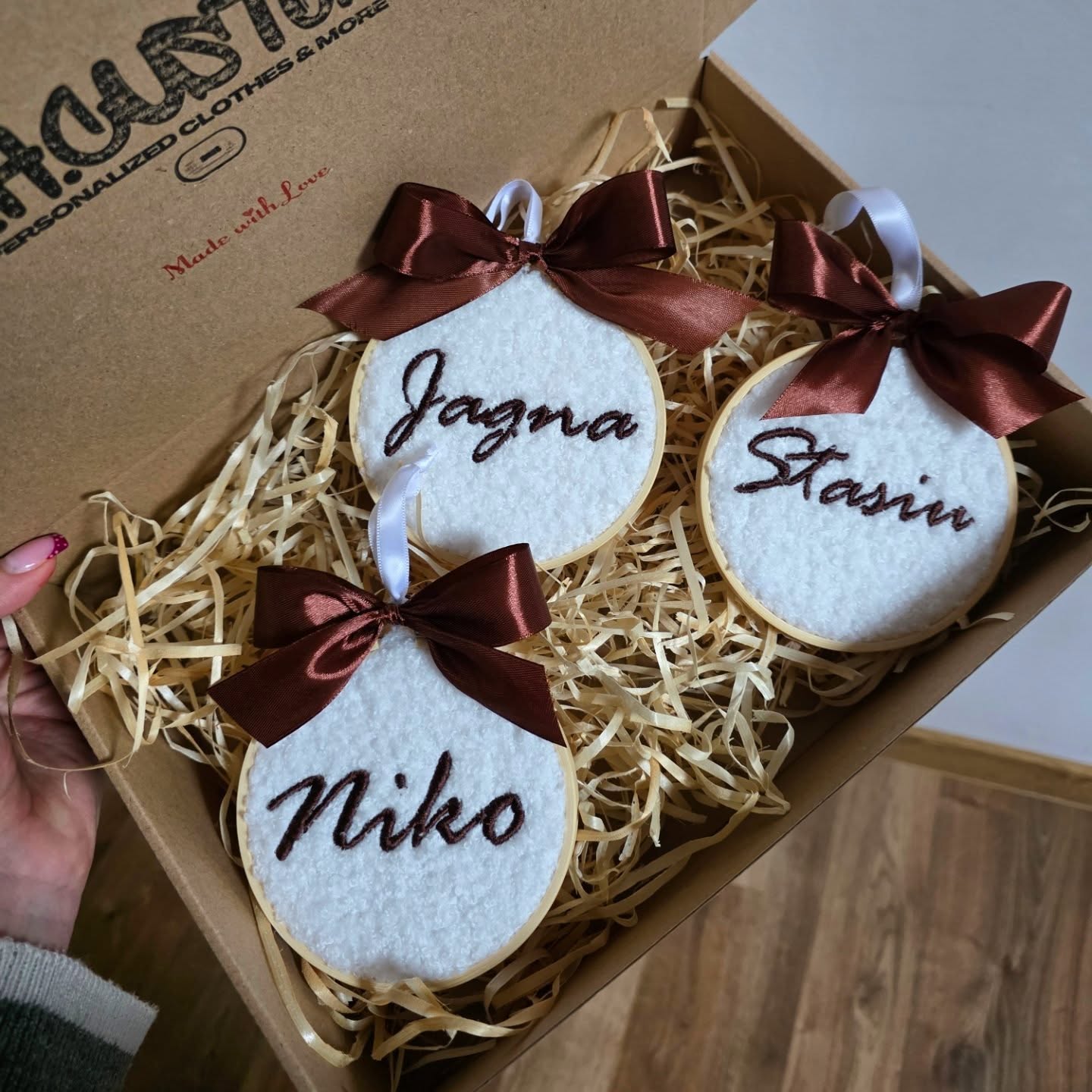 BARDZO WAŻNE : po dodaniu przedmiotu do koszyka, na stronie płatności zaznacz „dodaj notatkę do zamówienia” i tam podaj jakie imiona mają zostać wyhaftowane na bombkach